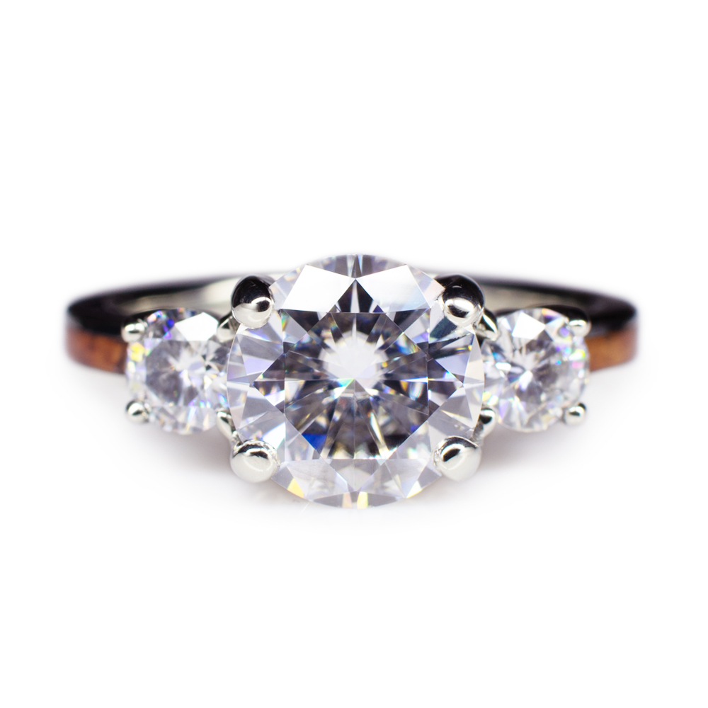 - If moissanites: 8mm main stone; 4mm side stones. Eye-clean, DEF color.